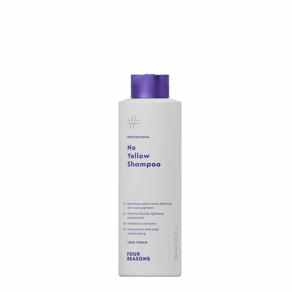 Four Reasons Professional No Yellow -linja on työvälineesi luonnonvaaleille, vaaleiksi raidoitetuille ja värjätyille hiuksille silloin, kun lämpimät, keltaiset pigmentit kiusaavat. Käytä tuotteita myös palauttamaan puhdas sävy harmaisiin hiuksiin silloin, kun niistä uhkaa tulla kiillottomat ja tunkkaiset.