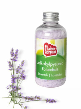 Rauhoittavan laventelin tuoksuinen jalkakylpysuola. Lilan väriset kiteet.