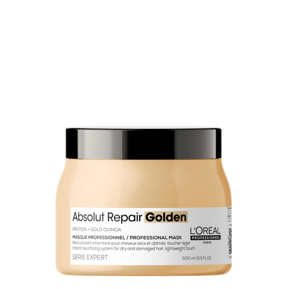Absolut Repair Golden Masque on intensiivinen uudistava ja kultainen tuote Gold quinoa + -proteiinilla, joka korjaa kaikki hiustyypit tekemättä niitä painaviksi. Tuotteen kermainen/geelikoostumus jättää hiukset pehmeiksi ja täyteen kiiltoa.