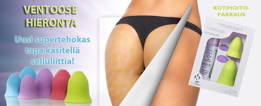 Ventoose selluliittihieronta kotihoitopakkaus :Sellulitti on rasvakertymää jota tavallisesti muodostuu reisiin, takapuoleen, käsivarsiin ja vatsaan. Perinnöllisten tekijöiden ja ruokavalion lisäksi ihon paksuus ja kimmoisuus vaikuttaa selluliitin näkyvyyteen. Selluliitti muodostuu elimistön kuona-aineista ja se saattaa aiheuttaa myös verenkierron häiriöitä. Siksi selluliittihoito ei ole pelkästään turhamaista, esteettistä hoitoa.Hiero 10 minuuttia päivässä, vähintään 3 x viikossa 21 päivän ajan. Vieläkin nopeampia tuloksia saat kun yhdistät hoitoon oikeanlaisen ruokavalion, juot riittävästi ja harrastat liikuntaa..